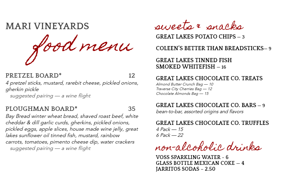 Our wine list features a wide selection of estate wines grown and produced on Old Mission Peninsula.